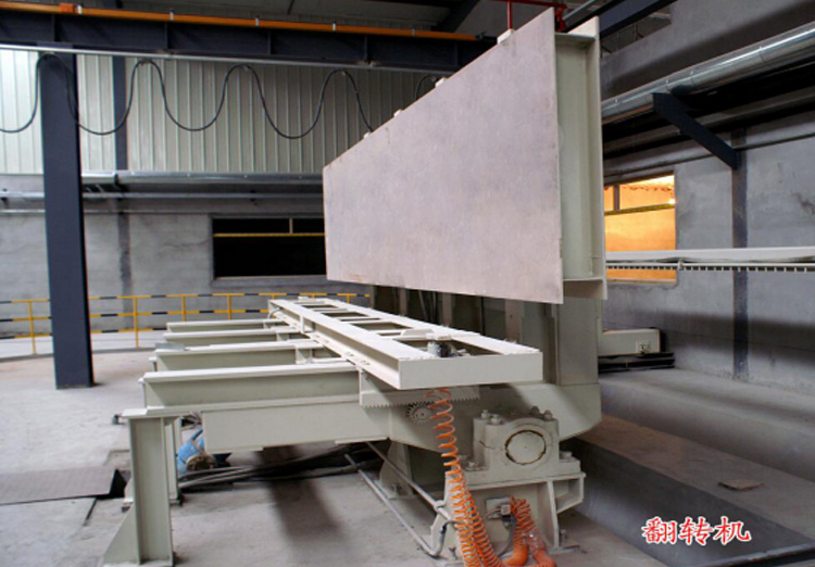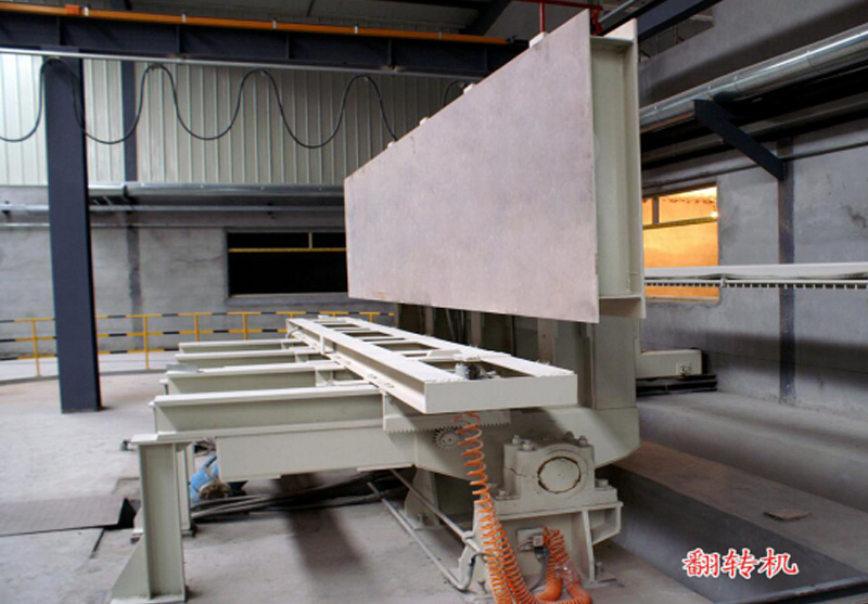 加氣磚成套生產(chǎn)線中用到的一種翻轉(zhuǎn)設(shè)備,翻轉(zhuǎn)臺(tái),主要是加氣線里面,切割完成后,坯體經(jīng)由翻轉(zhuǎn)臺(tái)90度翻轉(zhuǎn),再刮廢料機(jī)刮除坯體頂部和底部的廢料。