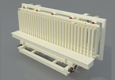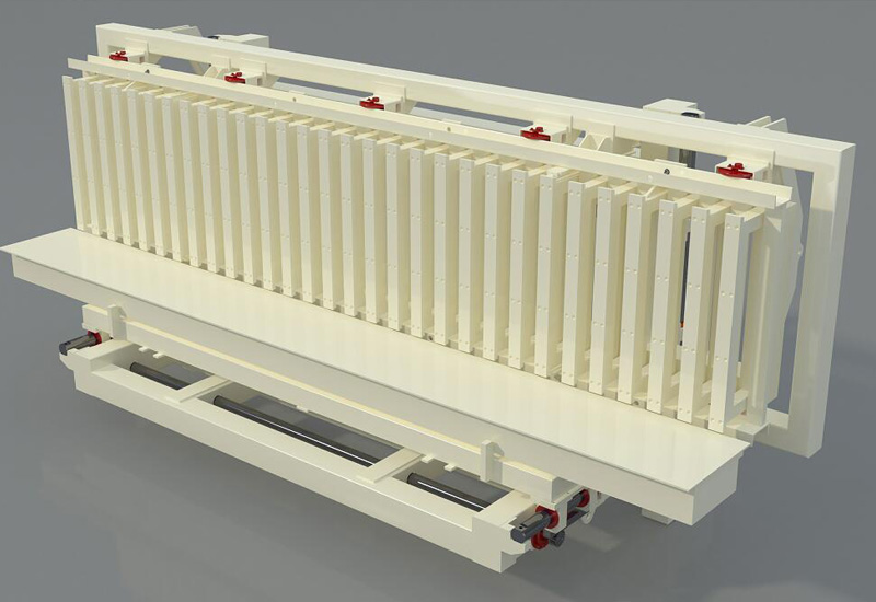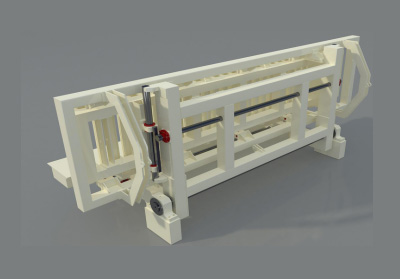 坯體切割底面會(huì)有一些廢料。翻轉(zhuǎn)臺(tái)將坯體在翻轉(zhuǎn)架上轉(zhuǎn)過(guò)90°后,坯體底面切割的表皮由水平位置轉(zhuǎn)變成垂直位置,在重力作用下,自動(dòng)脫落,坯體表面廢料被去除。翻轉(zhuǎn)臺(tái)全部采用液壓驅(qū)動(dòng)。翻轉(zhuǎn)油缸還具有終點(diǎn)緩沖性能。為了保證蒸養(yǎng)底板、側(cè)板在翻轉(zhuǎn)過(guò)程中的穩(wěn)固性,在它們處于翻轉(zhuǎn)位置時(shí)側(cè)面都設(shè)有鎖緊機(jī)構(gòu)。